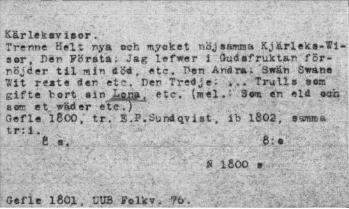 //// Kärleksvisor. //// Trenne Helt nya och inycket nöj samnsa Kjärleks-Wi-aor, Den Första; Jag lefwer i Gudsfruktan förnöj der til win död, etc. Fen And j»; Swan Swane ^'it reate den etc. Den Tredje; ... Tralls som gifte b ort »injtom, etc, (rael.^ 3«& en eld och son? et. wäder etcTT //// Gefle 1800; tr. S.P.öundqvist, ib 1Ö02, esrojsa tr; i . //// Sa. 0:o //// * 1800 m //// Gefle 1801, UUB Folkv, . ////