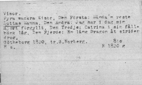 //// Visor. //// Fyra wackra "iisor, Dert Fcrsta; i*å«da'r rrste Lottas iiamma, Den Andra: nar 1 dag «ir //// Ho ort" förgyllt. Den Tredje: Catrira i a i r fåll-bark låe. Den Fjerde: Er» lår* Dragon åt strider dröp-, //// aöthebor* 182O, tr.S.Korberg. 8:0 //// ? 3. F 1820 (T ////