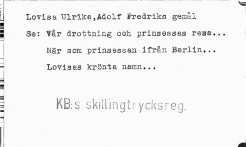 //// Lovisa Ulrika,Adolf Fredriks gemål { Se: Vår drottning och prinsessas resa... //// När som prinsessan ifrån Berlin... Lovisas krönta namn... //// i KB.s skillingtrycksreg. ////