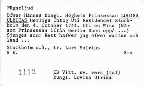 //// Fägneljud //// öfwer Hännes Kongl. Höghets Prinsessan LOUISA ULRICAS Herliea Intog Uti Residencet Stockholm den 4, October 1744. Uti en Wisa (NÄr som Prinsessan ifrån Berlin Rann opp/ ...) Sjunges som: Rest hafwer jag öfwer watten och land ... //// Stockholm u.å., tr. Lars Salvius 8 s. 8:o //// 1112 KB Vitt. sv. vers (tal) kungl. Lovisa Ulrika ////