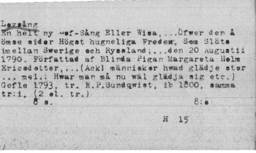 //// ZrTneTT ny -sf-3arg Eller Wi*», . . .öfwer der & ömse aidsr Högst hugneliga Fredeir, Sota Slöts imellan Swerige seh Rysaland ; . . en 20 augustii 1790. Författad af Blinda Pigan Margareta II sim Kricsd etter, , .. (Ackl nännisker hwad glädje stor .mel»; Hwar nar mu nu wäl glädja si £ etc.) Gofle 1793» tr. E. P.3undqwist, ib 1800, sarsma tr: i , (2 #1. tr.) //// ö a. 8; • //// H ////