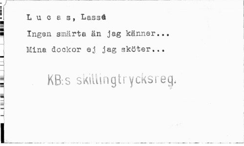 //// I L u c e s, Lasså I //// i Ingen smärta än jag känner... Mina dockor ej jag sköter... //// . KB.s skillingtrycksreg, //// i___:___ ////