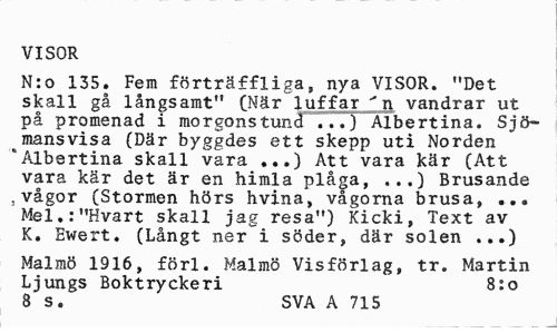 //// VISOR //// N:o 135. Fem förträffliga, nya VISOR. "Det skall gå långsamt" (När luffar ' n vandrar ut på promenad i morgonstund ...) Albertina. Sjömansvisa (Där byggdes ett skepp uti Norden "Albertina skall vara ...) Att vara kär (Att vara kär det är en himla plåga, ...) Brusande , vågor (Stormen hörs hvina, vågorna brusa, . .. Mel.:"Hvart skall jag resa") Kicki, Text av K. Ewert. (Långt ner i söder, där solen ...) //// Malmö 1916, förl. Malmö Visförlag, tr. Martin Ljungs Boktryckeri 8:0 //// 8 s. SVA A 715 ////