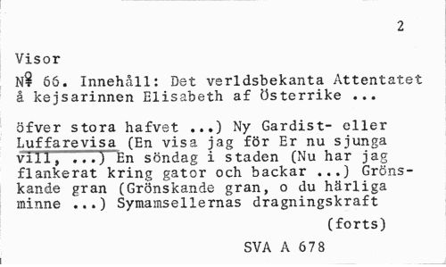 //// 2 //// Visor //// Nt 66. Innehåll: Det verldsbekanta Attentatet å kejsarinnen Elisabeth af Österrike ... //// öfver stora hafvet ...) Ny Gardist- eller Luffarevisa (En visa jag för Er nu sjunga vill, ...) En söndag i staden (Nu har jag flankerat kring gator och backar ...} Grönskande gran (Grönskande gran, o du härliga minne ...) Symamsellernas dragningskraft //// (forts) //// SVA A 678 ////