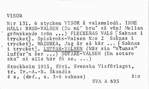 //// VISOR //// N: r 131. 6 stycken VISOR å valsmelodi. INNE HÄLL: BRUD-VALSEN (Du mi" bru" så vänJ Mellan * grönskande trän ...) FLECKERAS VALS [Saknas i trycketj . Spiskroks-Valsen N:o 2 Saknas i trycket]. MAZURKA. Jag är så kär ... fSaknas i trycket]. LUFFAR-VALSEN (När sin "stunsa" luffaren ser .'..) SÖT ARE-VALSEN (En sötare ska"* ni alla här få se. ., =>) //// Stockholm 1915, förl. Svenska Visförlaget, tr. Tr.-A.-B. Skandia //// 4 s. (def. , s. 3-6 saknas) 8:o //// SVA A 693 ////