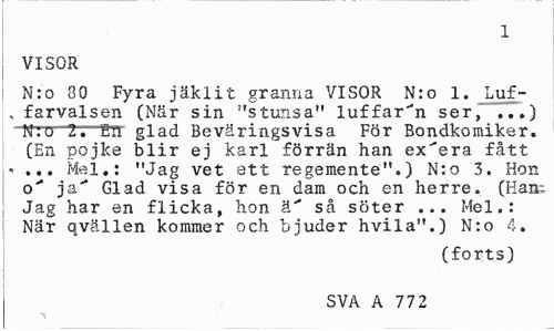 //// 1 //// VISOR //// N:o 80 Fyra jäklit granna VISOR N:o 1. Luf-, farvalsen (När sin "stunsa" luffaren ser, ,..) N:u 2. EH glad Beväringsvisa För Bondkomiker. (En pojke blir ej karl förrän han ex'era fått - ... Mel,: "Jag vet ett regemente".) N:o 3. Hon o" ja" Glad visa för en dam och en herre. (Kan; Jag har en flicka, hon ä" så söter ... Mel.: När qvällen kommer och bjuder hvila".) N:o 4. //// (forts) //// SVA A 77 2 ////
