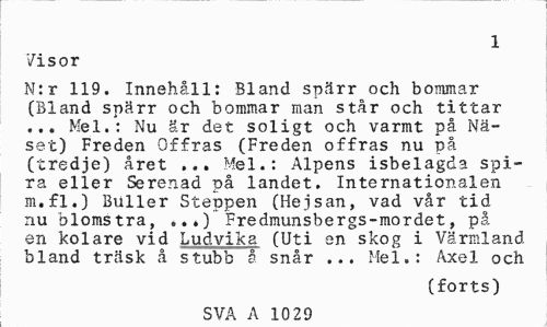 //// 1 //// Visor //// N:r 119. Innehåll: Bland spärr och bommar (Bland spärr och bommar man står och tittar ... Mel.: Nu är det soligt och varmt på Näset) Freden Offras (Freden offras nu på (tredje) året ... Mel.: Alpens isbelagda spira eller Serenad på landet. Internationalen m.fl.) Buller Steppen (Hejsan, vad vår tid nu blomstra, ..*) Fredmunsbergs-mordet, på en kolare vid Ludvika (Uti sn skog i Värmland-biand träsk å stubb å snår ... Mel.: Axel och //// (forts) //// SVA A 10 29 ////