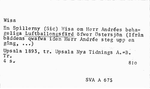 //// Wisa //// En Spillerny (Sic) Wisa om Herr Andrées behageliga Luftballongsfärd öfwer östersjön (Ifrån bäddens qwafwa iden Herr Andrée steg upp en gång, //// Upsala 1893, tr. Upsala Nya Tidnings A.»B, Tr. //// 4 S « 8:0 //// SVA A 6 75 ////
