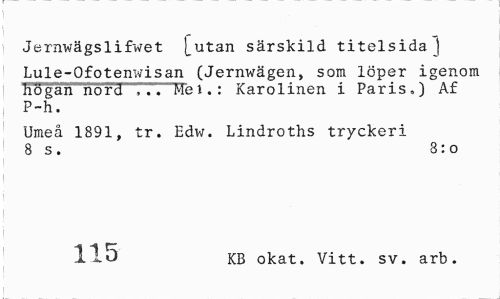 //// Jernwägslifwet [utan särskild titelsidaJ //// Lule-Ofotenwisan (Jernwägen, som löper igenom //// hog'ah"riord ... Me i. : Karolinen i Paris,) Af P-h. //// Umeå 1891, tr. Edw. Lindroths tryckeri //// 8 s. 8:0 //// 115 KB okat. Vitt. sv. arb. ////