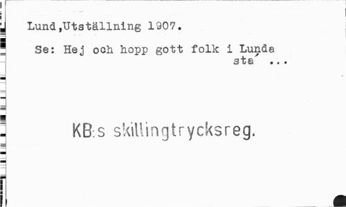 //// . Lund»Utställning 1907. //// ' Se: Hej och hopp gott folk i Lunda //// sta' ... //// - //// j //// J KB.s skillingtrycksreg. //// M ////