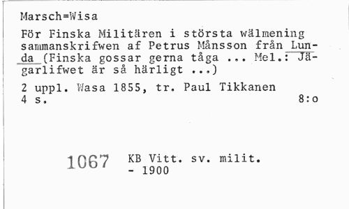 //// Marsch=Wisa //// För Finska Militären i största wälmening sammanskrifwen af Petrus Månsson från Lunda (Finska gossar gerna tåga ... Mel.: Jä-garlifwet är så härligt //// 2 uppl. Wasa 1855, tr. Paul Tikkanen 4 s. 8:o //// 1 HR7 KB Vitt. sv. milit. 1 - 1900 ////
