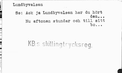 //// Lundbyvalsen //// i i //// S Se: Ack ja Lundbyvalsen har du hört //// 1 den».. //// Nu aftonen stundar och till sitt ~ bo... //// KB s skillingtrycksreg. //// M ////