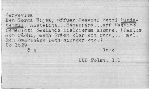 //// t //// sa //// Eert Sor.^ra Wijsa, öffuer Joaephi ?etri lund..*-hergii, hasteliga..,Hädartf ärd.,,aff Haquiro Senedicti Smolando Bielkiorum alumne. (PAulus rartha, medh Orden klar och-reen,... mel.' //// Een 3war>esång iagh si unge r etc.. ) Uo 1629 //// 8 s lo o //// UUB Folkv, 1:1 ////