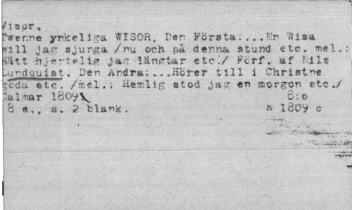 //// /ispr» //// farenne yrk e 1 i ^ra WISOR, Der Första;,.. Kr Wisa vill jap* sjurga /nu och p& denna stund etc, mel.: vitt *»jertelig ja?? längtar etc V fcrf. af fils //// Landquist. Den Andra;___Hörer till i Christne //// -eda etc. /mel.; Hemlig stod ja* en morgon etc./ Kalmar löoyv. 6:0 //// & s,, 3. 2 blank . h l3cy c ////
