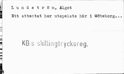 //// Lunds tröm, Algot j Ett attentat har utspelats här i Göteborg... //// J //// i KB s skillingtrycksreg, //// L ////