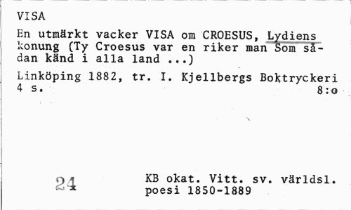 //// VISA //// En utmärkt vacker VISA om CROESUS, Lydiens konung (Ty Croesus var en riker man Som sådan känd i alla land ...) //// Linköping 1882, tr. I. Kjellbergs Boktryckeri 4 s. 8:0 //// O ' KB okat. Vitt. sv. världs!. //// - * poesi 1850-1889 ////