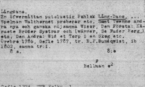 //// Langdans. //// Ers öfwermåttan putslustig Pohl sk Lång-Dans,, ... Spelman Walthornet proberar etc. 5i»nt~^werme and* ra nya och ganska nej samma Wisor, Den Första: Käraste Bröder Systrar och (wänner, Se Fader Berg,) ete . Den Andra: Wid et Torp i en Skog etc. Örehro 1786, Sefle 1787, tr. E.P.9undqirist, ib , I802, samma tr:i. //// 8 s. 8; o //// * 2 Beliman //// A. » » « -te-i i. «rs t « ////