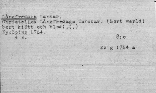 //// l!Érf«trffgE tArgfredaga Tanckar. (Bort verld J bort k lott och blod}.".,) Nyköping 1764. //// 4 s. c: o //// Za g 1764 a ////