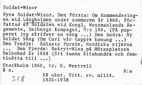 //// Soldat=Wisor //// Fyra Soldat=Wisor. Den Första: Om Kommendering-en wid Långholmen under sommaren år 1860. Författad af Soldaten wid Kongl. Westmanlands Regemente, Salbergs Kompagni, N:o 140. (På papperet jag skrifwer en sång ..,) Den Andra: Ny Soldat Sång (Om Carl wår tappre konung ...) Den Tredje: Ädlaste Furste, Nordiska stjerna ... Den Fjerde: Rekryt=Wisa på Mötesplatsen Salbohed år 1858 (Ett tusen åttahundra och femtioåtta till ...) //// Stockholm 1860, tr. E. Westrell //// 8 s, 8 : o //// 1 KB okat. Vitt. sv. milit. //// 6 /O 1835-1938 ////