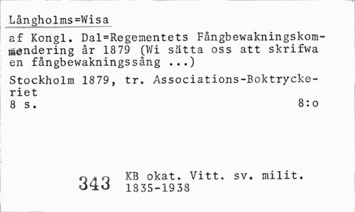 //// Långholms=Wisa //// af Kongl. Dal=Regementets Fångbewakningskom-mandering år 18 79 (Wi sätta oss att skrifwa en fångbewakningssång ...) //// Stockholm 1879, tr. Associations-Boktryckeriet //// 8 s. 8: o //// o a q KB okat. Vitt. sv. milit. 1835-1938 ////