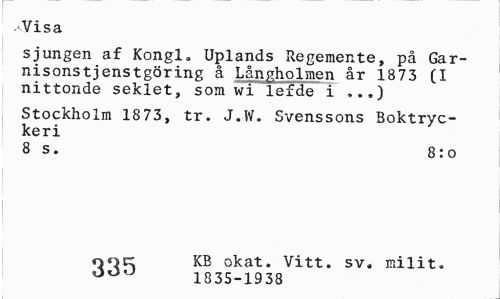 //// Visa //// sjungen af Kongl. Uplands Regemente, på Garnisons t jenstgöring å Långholmen år 1873 (I nittonde seklet, som wi lefde i ,»,) //// Stockholm 1873, tr. J.W. Svenssons Boktryckeri //// 8 s. 8:o //// OQi~ KB okat. Vitt. sv. milit. //// 1835-1938 ////
