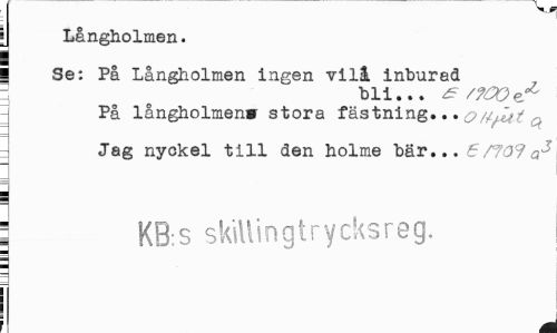 //// Långholmen. //// i Se: På Långholmen ingen vill inburad //// bli... ^ //// På långholmen» stora fästning... q //// Jag nyckel till den holme bär... <5/7 O? //// \ //// j KB s skillingtrycksreg. ////