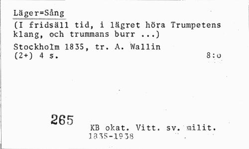 //// Läger=Sång //// (I fridsäll tid, i lägret höra Trumpetens klang, och trummans burr ...) //// Stockholm 1835, tr. A. Wallin //// (2 + ) 4 s» 8 : o //// 265 //// KB okat. Vitt. sv. milit. //// 13 35-1938 ////