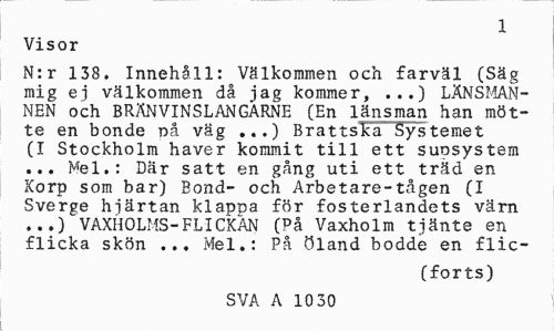//// 1 //// Visor //// N:r 138. Innehåll: Välkommen och farväl (Säg mig ej välkommen då jag kommer, ...) LÄNSMANNEN och BRÄNVINSLANGARNE (En länsman han mötte en bonde på väg ...) Brattska" Sys temet (I Stockholm haver kommit till ett supsystem ... Mel.: Där satt en gång uti ett träd en Korp som bar) Bond- och Arbetare-tågen (I Sverge hjärtan klappa för fosterlandets värn ,..) VAXHOLMS-FLICKAN (På Vaxholm tjänte en flicka skön ... Mel.: På Öland bodde en flic- //// (forts) //// SVA A 10 30 ////