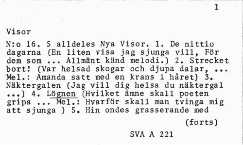 //// 1 //// Visor //// N:o 16. 5 alldeles Nya Visor. 1. De nittio dagarna (En liten visa jag sjunga vill, För dem som ... Allmänt känd melodi.) 2. Strecket bort.1 (Var helsad skogar och djupa dalar, ... Mel.: Amanda satt med en krans i håret) 3. Näktergalen (Jag vill dig helsa du näktergal ...) 4. Lögnen (Hvilket ämne skall poeten gripa ... Mel.: Hvarför skall man tvinga mig att sjunga ) 5. Hin ondes grasserande med //// (forts) //// SVA A 221 ////