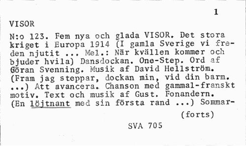 //// 1 //// VISOR //// N:o 123. Fem nya och glada VISOR. Det stora kriget i Europa 1914 (I gamla Sverige vi freden njutit ... Mel.: När kvällen kommer och bjuder hvila) Dansdockan. One-Step. Ord af 6öran Svenning. Musik af David Hellström. (Fram jag steppar, dockan min, vid din barm. ...) Att avancera. Chanson med. gammal-franskt motiv. Text och musik af Gust. Fonandern. (En löjtnant med sin första rand ...) Sommar- //// (forts) //// SVA 70 5 ////
