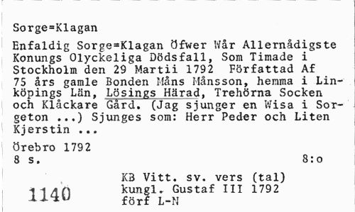 //// Sorge-Klagan //// Enfaldig Sorge-Klagan öfwer Wår Allernådigste Konungs Olyckeliga Dödsfall, Som Timade i Stockholm den 29 Martii 1792 Författad Af 75 års gamle Bonden Måns Månsson, hemma i Linköpings Län, Lösings Härad, Trehörna Socken och Klåckare Gård. (Jag sjunger en Wisa i Sorgeton ...) Sjunges som: Herr Peder och Liten Kjerstin ... //// Örebro 1792 //// 8 s. 8: o //// KB Vitt. sv. vers (tal) i 1 a n kungl. Gustaf III 1792 //// il^U fö rf L-N ////
