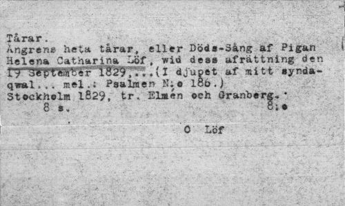//// Tårar. //// Angrene heta tårar, eller Döds-Sång af Pigan Helena Catharina LSf. vrid dess afrättning den //// I i...3!f IJtlSf^lr . (I djupet af mitt synda- //// qwal.,. mel.; Psalmen N;o 186.) Stockholm 1829, tr. Elmen och 0ranberg„• 8 s. 8;o //// 0 Löf //// .i ' - . ' . - ' .' " • • ¦ / ' . . - • . , ////