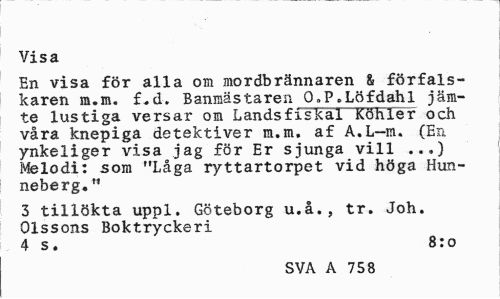 //// Visa //// En visa för alla om mordbrännaren & förfalskaren m.m. f.d. Banmästaren O.P.Löfdahl jämte lustiga versar om Landsfiskal Köhler och våra knepiga detektiver m.m. af A.L-m. (En ynkeliger visa jag för Er sjunga vill ...) Melodi: som "Låga ryttartorpet vid höga Hunneberg. " //// 3 tillökta uppl. Göteborg u.å., tr. Joh. Olssons Boktryckeri //// 4 s. 8:0 //// SVA A 6 23 ////