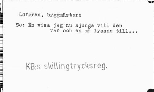 //// | Löf gren, "byggmästare //// ' Se: En visa jag nu sjunga vill den //// var och en må lyssna till... //// I //// j KB:S skillingtrycksreg. ////