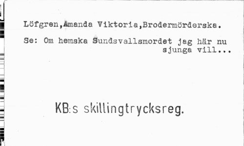 //// | Löfgren»Åmanda Vlktoria,Brodermörderska. //// Se: Om hemska Sundsvallsmordet jag här nu //// sjunga vill... //// 3 j //// a KB:S skillingtrycksreg. //// i ////