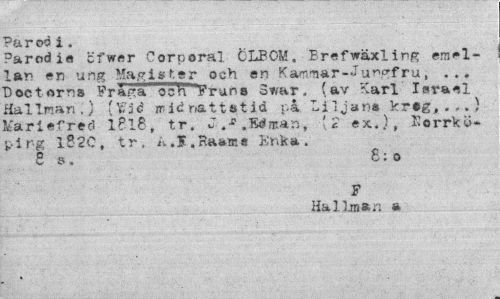 //// ?aroa i . //// Parodin cfwer Corporal OLEOM. Brefwäxling emellan en ung Magister och en Kanrnar--ungfru, ... "Doctorns Fr äga" o b'h" ""Fruns Swar. (av Karl Israel Hallman .) [%'ié nid nattstid j-i Liljans krog,...} Mariefred l8l8, tr. J.-^.Bdman, ' 2 ex,), Eorrkii-t-i rg 182C, tr , is.»I.Raama Knka . //// 8 3. £;o //// F //// Hallman a ////