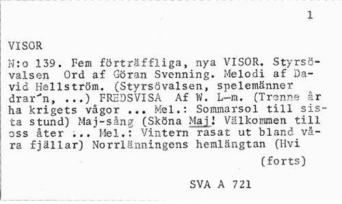 //// 1 //// VISOR //// N:o 139. Fem förträffliga, nya VISOR. Styrsö-valsen Ord af Göran Svenning. Melodi af David Hellström. (Styrsövalsen, spelemänner drar"n, ...) FREDSVISA Af W. L-m. (Trenne år ha krigets vågor ... Mel.: Sommarsol till sista stund) Maj-sång (Sköna Maj I Välkommen till oss åter ... Mel.: Vintern rasat ut bland våra fjällar) Norrlänningens hemlängtan (Hvi //// (forts) //// SVA A 7 21 ////