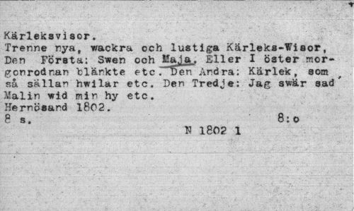 //// Kärleksvi sor. //// Trenne nya, wackra och lustiga Kärleks-Wieor, Den Första; Swen och Ma.ja_. Eller I öster mor-gonrodnan blänkte etc. Den Andra; Kärlek, som så sällan hwilar etc. Den Tredje; Jag swär sad' Malin wid min hy etc. Hernösand 1802. //// 8 s. 8:0 //// N 1802 1 ////