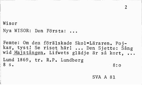 //// 2 //// Wisor //// Nya WISOR: Den Första: ... //// Femte: Om den förälskade Skol=Läraren. Pojkar, tyst] Se riset häri ... Den Sjette: Sång wid Majstången. Lifwets glädje är så kort, ... //// Lund 1869, tr. R.P. Lundberg 8 s. 8:o //// SVA A 81 ////