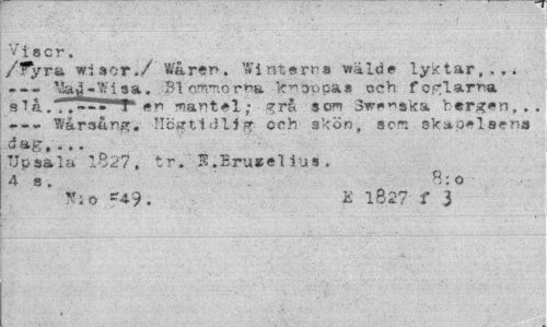 //// Visor. //// /fyra wisor./ Wårer». Wint.oma wälöe lyktar, ... //// sa. Bl c-morna knoppas och förlam ni k. jti.r"*?" en mantel; ^rå sot« swenska herafon. . . --- Wårsurg, Högtidlig och- skön , som skapelsen» dag«... //// Upsala 1827. tr. E.EruseUus. 4 s. 8:0 //// y 1 o x 1827 f 3 ////