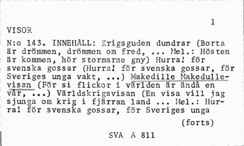 //// 1 //// VISOR //// N:o 143. INNEHÅLL: Krigsguden dundrar (Borta är drömmen, drömmen om fred, ... Hel.: Hösten är kommen, hör stormarne gny) Hurra.' för svenska gossar (Hurra.' för svenska gossar, för Sveriges unga vakt, ...) Makedille Makedulle-visan (För si flickor i världen är ändå en vår, ...) Världskrigsvisan (En visa vill jag sjunga om krig i fjärran land ... Mel.: Hurra! för svenska gossar, för Sveriges unga //// (forts) //// SVA A 811 ////