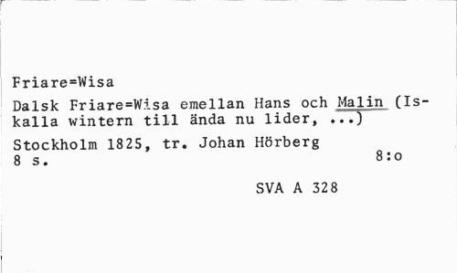 //// Friare=Wisa //// Dalsk Friare=Wisa emellan Hans och Malin (Iskalla wintern till ända nu lider, ...) //// Stockholm 1825, tr. Johan Hörberg 8 s. 8:0 //// SVA A 32 8 ////