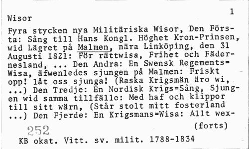 //// Wisor 1 //// Fyra stycken nya Militäriska Wisor, Den Första: Sång till Hans Kongl. Höghet Kron-Prinsen, wid Lägret på Malmen, nära Linköping, den 31 Augusti 1821: För rättwisa, Frihet och Fädernesland, ... Den Andra: En Swensk Regements= Wisa, äfwenledes sjungen på Malmen: Friskt opp! låt oss sjunga! (Raska Krigsmän äro wi, ...) Den Tredje: En Nordisk Krigs=Sång, Sjungen wid samma tillfälle: Med haf och klippor till sitt wärn, (Står stolt mitt fosterland ...) Den Fjerde: En Krigsmans=Wisa: Allt wex- //// 252 (£orts) //// KB okat. Vitt. sv. milit. 1788-1834 ////