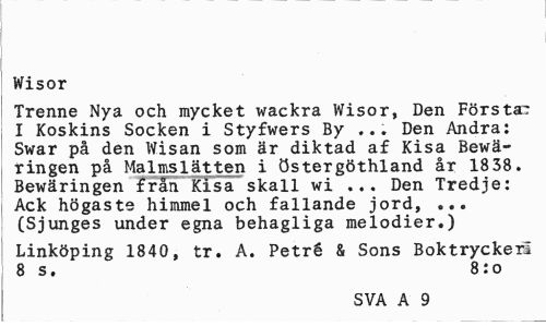 //// Wisor //// Trenne Nya och mycket wackra Wisor, Den Förstam I Koskins Socken i Styfwers By ... Den Andra: Swar på den Wisan som är diktad af Kisa Bewäringen på Malmslätten i östergöthland år 1838. Bewäringen från Kisa skall wi ... Den Tredje: Ack högaste himmel och fallande jord, ... (Sjunges under egna behagliga melodier.) //// Linköping 1840, tr. A. Petré & Sons Boktryckeri 8 s. 8: o //// SVA A 9 ////