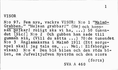 //// 1 //// VISOR //// N:o 97. Fem nya, vackra VISOR: N:o 1 "Malmö-Grabben." "Hejsan grabbarJ" (Hej och hoppsan pojkar.' roligt ska vi ha, ...) 50 tusen-dut [Sic.'3 N:o 2 Och gubben han sade till gumman sin, (Vill du sätta ,..) 70:de tusendet N:o 3 Änglamakarna i Malmö 1911 (Ett sorgespel skall jag tala om, ... Mel.: Elfsborgs-visan) N:o 4 Den blå bilen och den röda bilen, om Jufveltjufven Nyström och den stora //// (forts) //// SVA A 46 0 ////