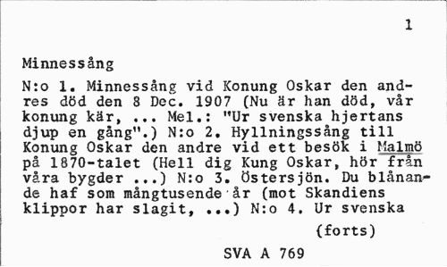 //// 1 //// Minnessång //// N:o 1. Minnessång vid Konung Oskar den andres död den 8 Dec. 1907 (Nu är han död, vår konung kär, ... Mel.: "Ur svenska hjertans djup en gång".) N:o 2, Hyllningssång till Konung Oskar den andre vid ett besök i Malmö på 1870-talet (Hell dig Kung Oskar, hör från våra bygder ...) N:o 3. Östersjön. Du blånande haf som mångtusende'år (mot Skandiens klippor har slagit, ...) N:o 4. Ur svenska //// (forts) //// SVA A 769 ////