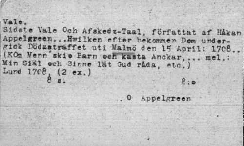 //// f k '.l . . . - > » ^ Val®. //// Sidste Vale Och Afskeds-Taal, författat af Håkan Appelgreen.. .H-wilken efter bekommer Dem undergick Dödastraffet uti Malmö der. 1* April; 17C8.. (Kön Menn*skie Barn ©elf kasta Anckar,.,. mel,; Min Siäl och Sinne lät Gud råda, etc.) Lund 170Ö. (2 ex.) //// 8 e. 8 ; B //// . O Appel/^reen //// ¦'< - . ////