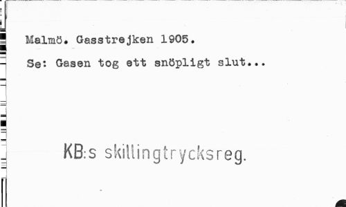 //// ! Malmö. Gasstrejken 1905. - Se*. Gasen tog ett snöpligt slut... //// i //// i //// j KB:S skillingtrycksreg. ////