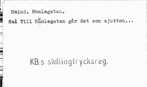 //// J Malmö, Humlegatan, //// = Sel Till Humlegatan går det som sjutton... //// KB:s skillingtrycksreg. //// i ////