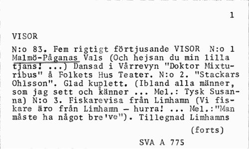 //// 1 //// VISOR //// N:o 83. Fem rigtigt förtjusande VISOR N:o 1 Malmö-Påganas Vals (Och hejsan du min lilla tjansj ...) Dansad i Vårrevyn "Doktor Mixtu-ribus" å Folkets Hus Teater. N:o 2. "Stackars Ohlsson". Glad kuplett. (Ibland alla männer, som jag sett och känner ... Mel.: Tysk Susanna) N:o 3. Fiskarevisa från Limhamn (Vi fiskare äro från Limhamn — hurra.' ... Mel.: "Man måste ha något bre've"). Tillegnad Limhamns //// (forts) //// SVA A 775 ////